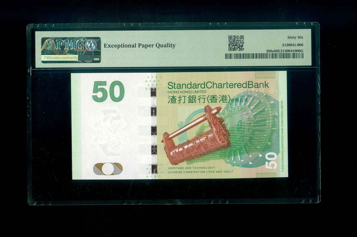 2016 香港渣打銀行 $50 PMG 66 EPQ 編號:CX309888(豹子號,頂級雪白)