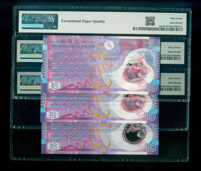 2014 香港特區政府 $10 PMG 67 EPQ 編號:ZZ863328-30(共3張,補版連號,頂級雪白)